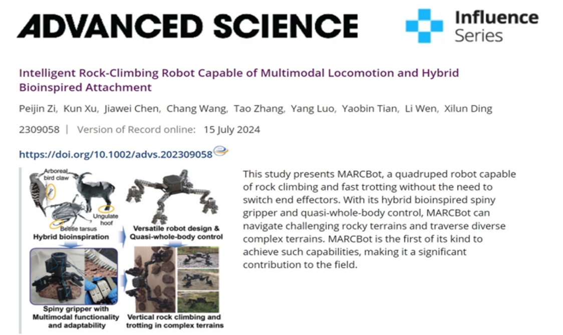 机械工程及自动化学院研发的多模态智能攀岩机器人MARCBot也在《Advanced Science》得以发表,展示了其在非结构环境中的攀爬能力,是力学、电学、控制学、机器人学、材料科学、电子工程、物理学等多个学科交叉合作的典范。