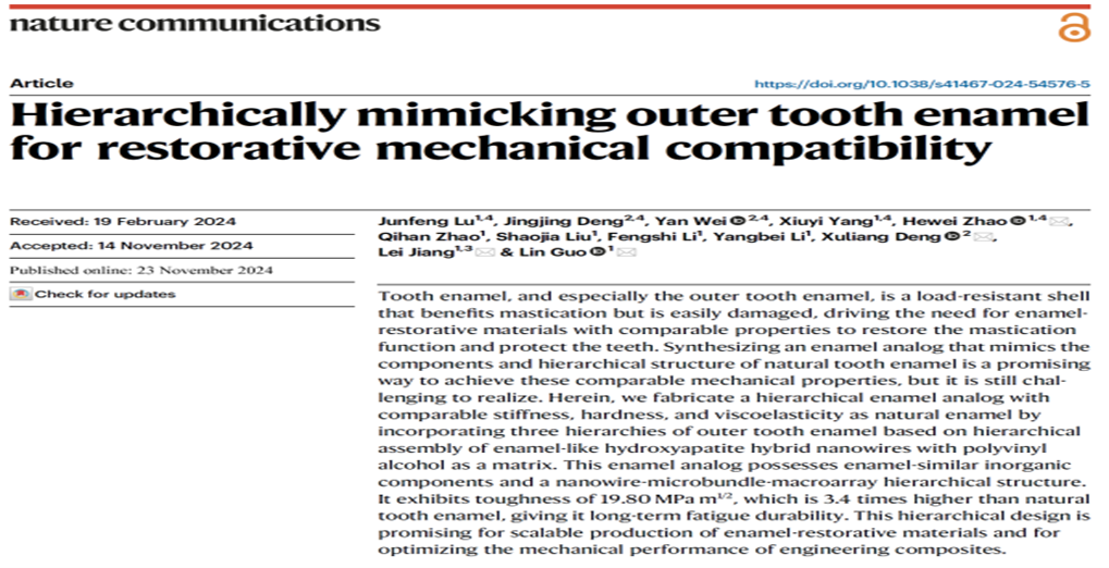 同月,化学学院郭林教授和江雷院士团队及合作者在多级次仿生牙釉质复合材料的制备及性能研究方面取得了重要的进展,相关工作以“Hierarchically mimickinouter tooth enamel for restorative mechanical compatibility”为题,在线发表于《自然·通讯》(Nature Communications)期刊。
