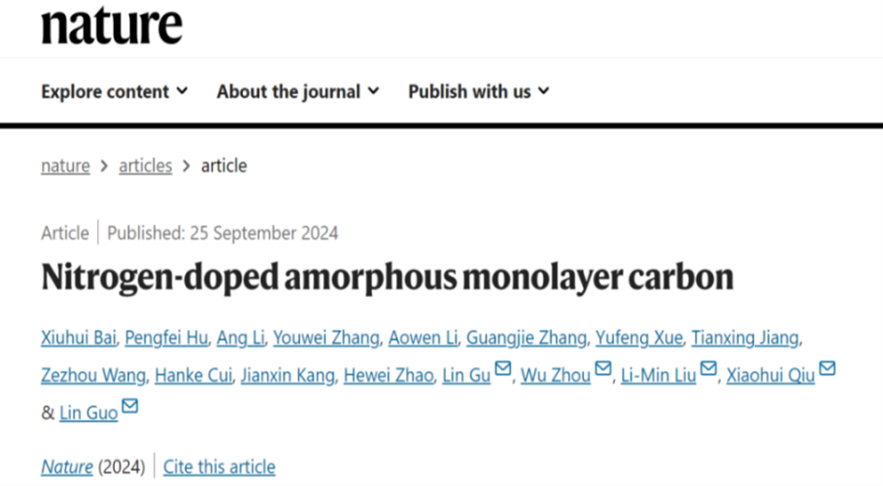化学学院郭林教授和物理学院刘利民教授的研究团队与中国科学院大学、国家纳米科学中心、清华大学在氮掺杂单原子层非晶碳的可控合成上取得了重大进展,该成果发表于《Nature》,题为“Nitrogen-doped amorphous monolayer carbon”。