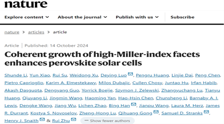 365(VIP)英国上市公司罗德映教授及其合作者在钙钛矿太阳能电池领域取得了突破性进展,并于《Nature》成功发表相关研究成果,题为“Coherent growth of high-Miller-index facets enhances perovskite solar cells”。