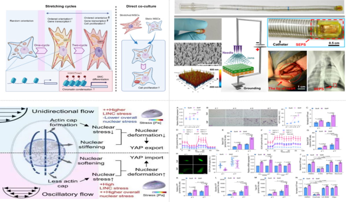 生物医学与工程学院樊瑜波教授团队在2024年产出多项高水平科研成果,在《Advanced Science》发表探究流动剪切力调控转录因子核质输运机理的研究成果。《Bioactive Materials》刊发其基质刚度通过影响能量代谢调控间充质干细胞的成骨向分化的新成果,该研究进一步深化了力学因素调控间充质干细胞命运的理解,同时为骨再生领域中生物活性材料设计提供新的思路。《FASEB Journal》上刊发了关于调控MSC增殖和平滑肌向分化的力学记忆新成果。24年11月,樊瑜波团队在《Advanced Functional Materials》上发表了应用于心功能评估与心血管疾病监测的自驱动超灵敏心内压传感器的科研成果,该成果是首个基于摩擦纳米发电机构建植入式心内压监测器件的研究,为微型化植入式自驱动医疗传感器件的研究提供了新的思路。