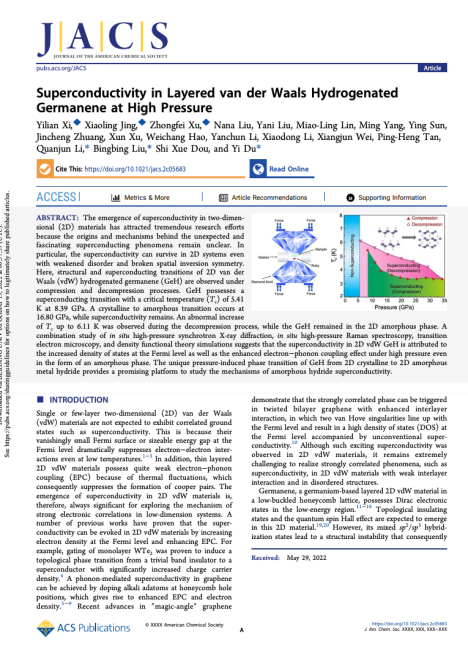 近期,北航国际交叉科学研究院量子与物质科学研究中心杜轶教授作为通讯作者在J. Am. Chem. Soc.上发表了封面论文《Superconductivity in Layered van der Waals Hydrogenated Germanene at High Press》(揭示层状范德华材料氢化锗烯高压超导电性)。本文由杜轶教授/郝维昌教授领导的表面物理与量子物质研究团队团队与吉林大学超硬材料国家重点实验室刘冰冰教授/李全军教授课题组共同完成。利用元素替代的化学方法制备高质量的层状范德华材料氢化锗烯(GeH)单晶样品,并通过对该样品开展详细的高压电输运性质测量,发现 GeH 在 8.39 GPa 时发生超导转变,临界温度 (Tc) 为 5.41 K。Tc 随压力增加而递减, GeH 在16.80 GPa处发生从晶态到非晶态的转变,但是超导仍然存在。同时,在卸压过程中观察到超导转变温度异常增加至 6.11 K,而 GeH 仍保持二维非晶相,这表明卸压增强其超导。原位高压同步辐射XRD、原位高压Raman、TEM/STEM和密度泛函理论的综合研究表明,高压下二维范德华材料 GeH的超导电性归因于GeH在高压下发生去氢过程,费米面附近电子态密度(DOS)的增加以及高压下电子-声子耦合效应的增强,即使是在非晶态情况下仍保持超导状态。而卸压过程Tc的异常升高则归因于面内Ge-Ge的声子软化。GeH从二维晶态到二维非晶态的独特压力诱导相变,为研究非晶态氢化物超导机制提供了一个很好的研究平台。