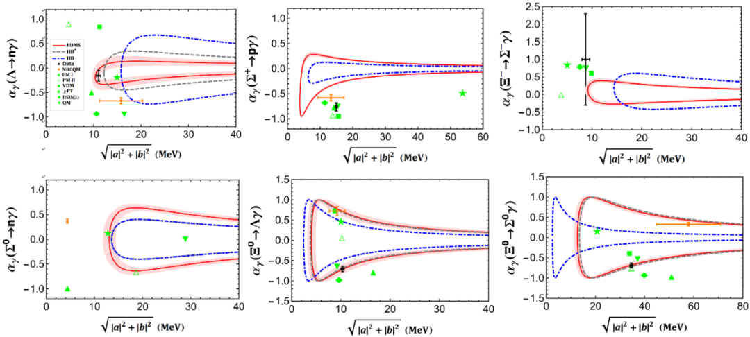图3:六个超子弱辐射(八重态)衰变道的不对称参数随宇称守恒振幅a的变化:横坐标可认为是衰变分之比,纵坐标为不对称参数。红色的线以及阴影区域为本工作的计算结果。黑色的误差条代表了最新的实验数据。剩余颜色的线和图形是其它理论模型、方法预测的结果