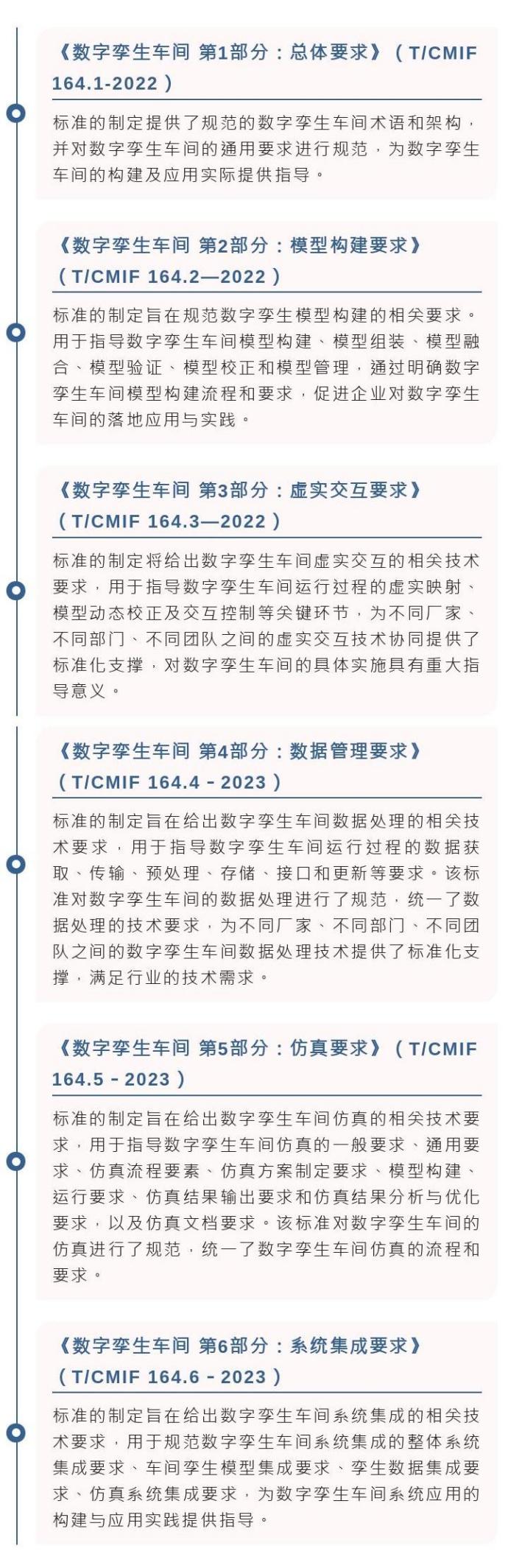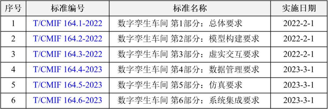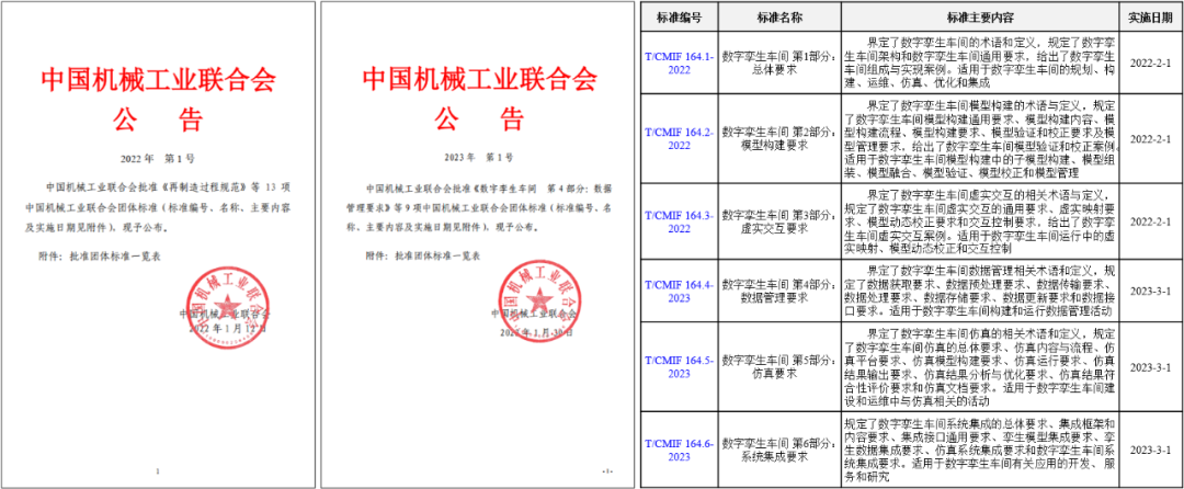 经中国机械工业联合会批准并正式发文公告,2022年1月12日,《数字孪生车间系列团体标准》第1-3部分正式发布实施,2023年1月30日,《数字孪生车间系列团体标准》第4-6部分正式发布实施。