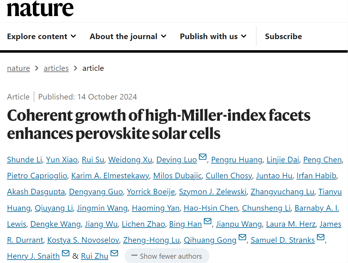 转载自北航新闻网10月18日电(通讯员 杨文强)2024年10月14日,《Nature》报道了我院罗德映教授和合作者在钙钛矿太阳能电池研究方面取得的最新进展:《Coherent growth of high-Miller-index facets enhances perovskite solar cells》。围绕反式钙钛矿太阳能电池面临“光子利用与电学损失”难以协同调控的关键技术挑战,该工作成功解密环境温度在钙钛矿半导体工艺中的重要作用,并基于此开发了能够实现钙钛矿微米级厚膜“光子利用与电学损失”协同调控的创新工艺技术,从而研制出高效稳定的反式钙钛矿太阳能电池。北航国际前沿交叉科学研究院罗德映教授、宁波东方理工大学韩兵助理教授、英国剑桥大学Samuel D. Stranks教授、英国牛津大学Henry J. Snaith院士、北京大学龚旗煌院士、北京大学朱瑞教授为通讯作者,北京航空航天大学为主要通讯单位之一。