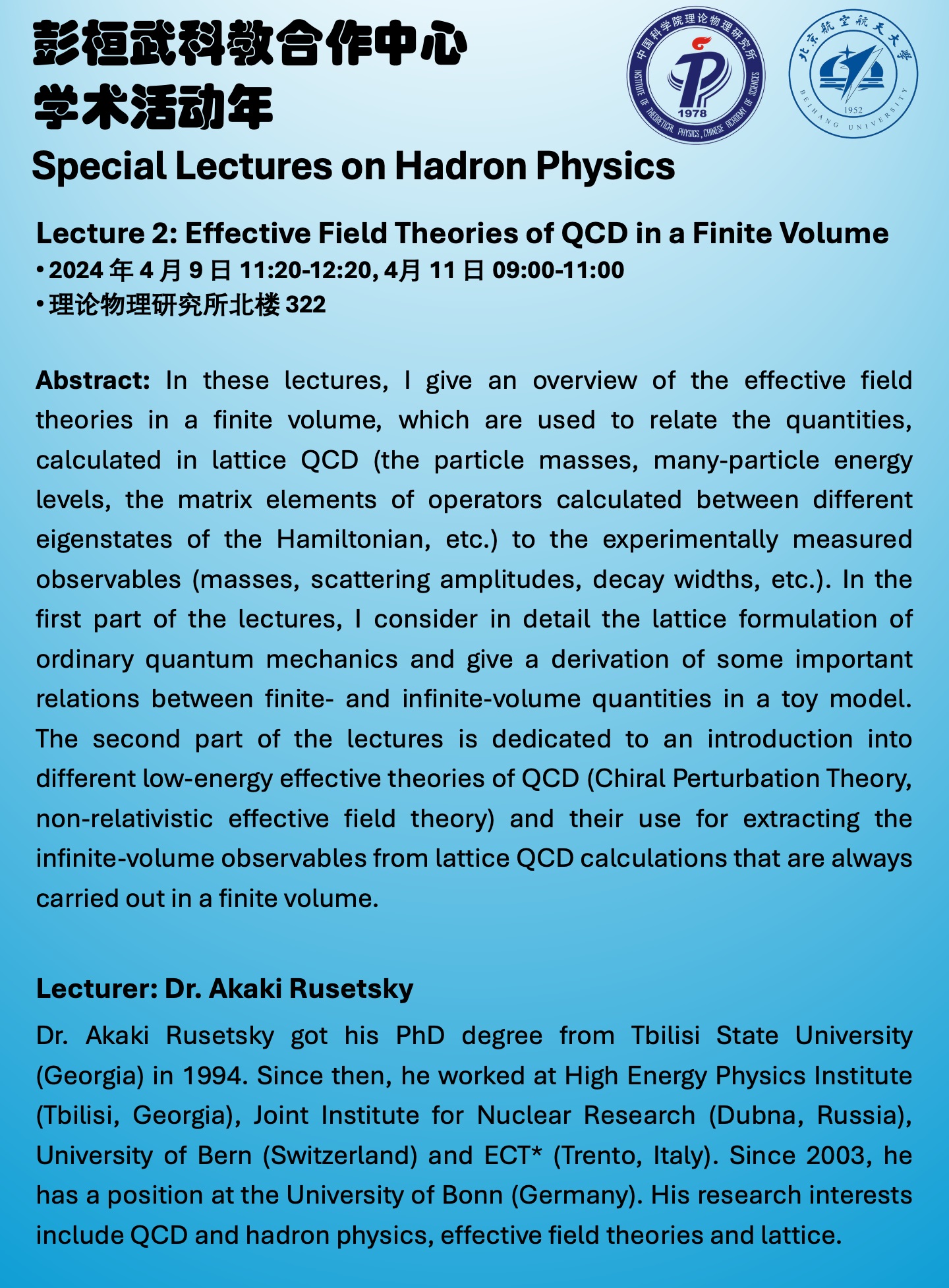Dr.Akaki Rusetsky got his PhD degree from Tbilisi State University(Georgia)in 1994.Since then,he worked at High Energy Physics Institute(Tbilisi, Georgia), Joint Institute for Nuclear Research(Dubna, Russia), University of Bern(Switzerland)and ECT*(Trento, Italy). Since 2003, he has a position at the University of Bonn (Germany). His research interests include QCD and hadron physics, effective field theories and lattice.