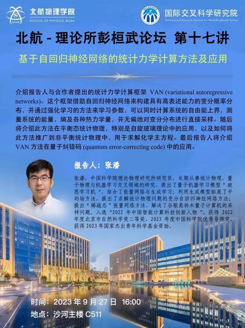 张潘将介绍他与合作者提出的统计力学计算框架VAN (variational autoregressive networks)。这个框架借助自回归神经网络来构建具有高表述能力的变分概率分布,并通过强化学习的方法来学习参数,可以同时计算系统的自由能上界,测量系统的能量,熵及各种热力学量,并无偏地对变分分布进行直接采样。然后张潘将介绍此方法在平衡态统计物理,特别是自旋玻璃理论中的应用,并介绍如何将此方法推广到非平衡统计物理中,用于求解化学主方程。最后张潘将介绍VAN方法在量子纠错码(quantum error-correcting code) 中的应用。