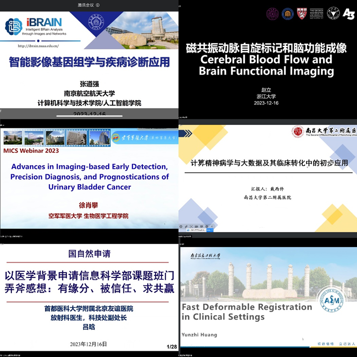 本次会议邀请到南京航空航天大学张道强教授、浙江大学生物医学工程与仪器科学学院赵立研究员、空军军医大学徐肖攀副教授、南昌大学第二附属医院戴西件教授、首都医科大学附属北京友谊医院吕晗副教授、南京信息工程大学黄韫栀助理教授作报告,南京信息工程大学徐军教授致辞,北京航空航天大学医工交叉中心许燕教授主持会议。